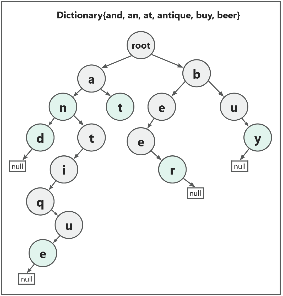 Trie is a k-way tree with each of its nodes having a label. This label uses true or false to distinguish Terminal Nodes and Non-Terminal Nodes. Terminal Nodes stand for a word from the letters starting from the root, while Non-Terminal Nodes are part of a word and do not form a word. The root node is labeled false and stands for an empty string. Each node is connected to its children nodes letter-wise.